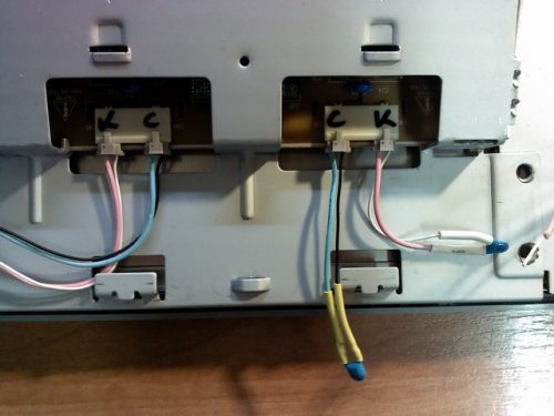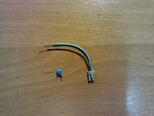 Отсюда методом исключения сделан вывод, что виной всему просто отгоревший контакт от одной из ламп, и необходима её замена. Вот собственно и вся диагностика неисправности. Но подходящей лампы под рукой не оказалось, на разборке ничего подходящего то же не нашлось. Заказывать оригинальную лампу такой же длины у поставщика дело не быстрое, да и не очень дёшево, а клиент торопит с ремонтом. По согласованию с клиентом было принято решение подпаять эмулятор, заменитель лампы подсветки и таким образом обмануть инвертор, дав ему необходимую нагрузку ничего не перерезая и не нарушая целостность платы. Мы использовали обычный копеечный конденсатор номиналом 47 pF 2 kV., но с запасом по напряжению. Отрезали коннектор от не рабочей лампы и подпаяли к нему конденсатор — эмулятор, обязательно посадив на термоусадочную трубку, что — бы не произошло замыкание на корпус.